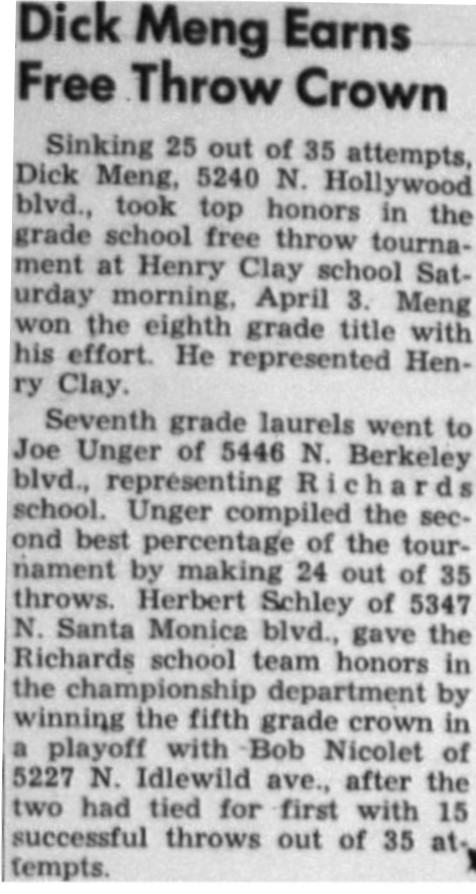 Perhaps the most interesting tournament occurred in 1948 when in the 5th grade competition Richards’ Herbert Schley took down Henry Clay’s Bob Nicolet in extra throws.