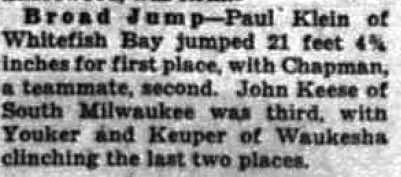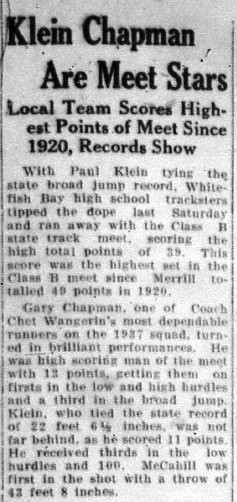 At the 1937 State track meet the Whitefish Bay high school tracksters tipped the dope and ran away with the Class B State title, with Paul Klein setting the Class B State record and tying the overall State record in the Broad Jump with his 22-6-1/2 at Camp Randall. Klein also finished third in the 100 and Low Hurdles