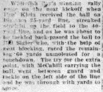 I know it’s hard to read. My interpretation is that Klein fielded the kickoff as a decoy, went as far as he could while drawing the gullible Greyhounds with him and before being tackled lateraled to junior Bill Sigler, who then took it to the house. Sigler was yet another great Bay athlete of the 1930s — 1st Team All-Suburban in football as a senior and won a State title in the Shot Put.