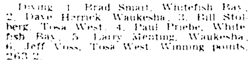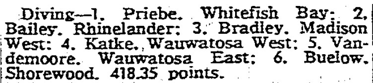 We’ll never know what would have happened at State if Priebe had qualified. Jon Abbott from Waukesha finished second. Scrolling back up you’ll see that Priebe had several scalps over Abbott in Suburban competitions, while the reverse was true as well. Madison Central junior Larry Franklin won in 23-6, just an inch short of the 23-7 1944 State record of Shorewood’s Ralph Welton.