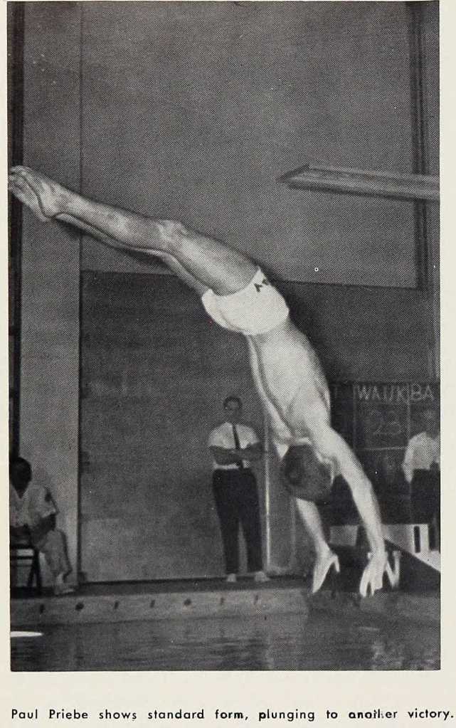 The first pool at the Bay opened in the fall of 1949. I’m curious how Coach Morgan Byers divided things up between swimmers and divers after he became the swimming coach in the 1950s. Somebody had to be there practicing every morning from 6:30-7:45 AM, right? No separate area for divers in those days.