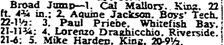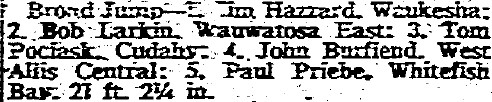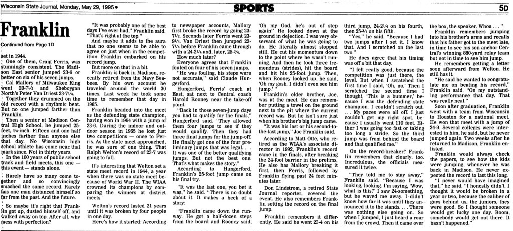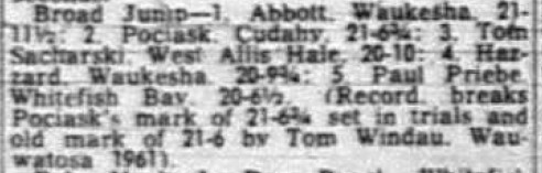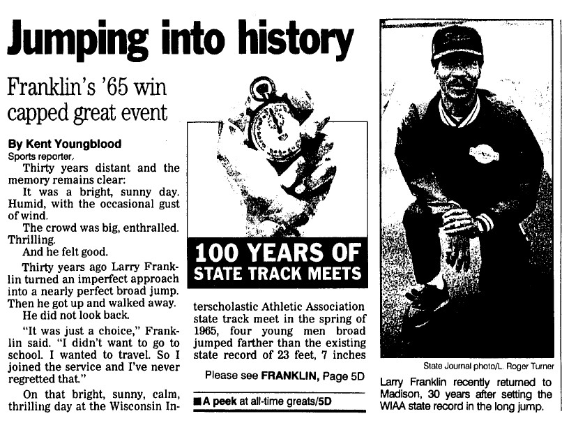 In 1995 the Wisconsin State Journal in Madison had a six-part series celebrating the 100th anniversary of WIAA track and field. One of the six parts was solely dedicated to the 1965 Broad Jump.