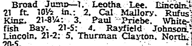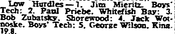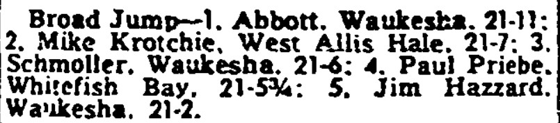 So Priebe didn’t qualify in the Broad Jump, but did in the 180 Lows. The 21-11-3/4 was the 5th best sectional jump and would have qualified for State under rules in place ever since. Another sectional was held at Nicolet on the same day, just a mile from the Bay. 19-7 and 19-6 qualified. I have no words.
