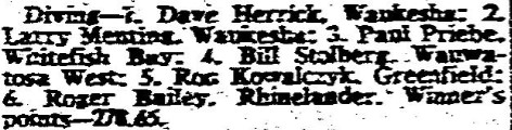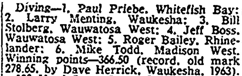 The Bay went into the 1964 State Meet as one of the favorites, but other than John Seefeld in the throws and Priebe placing in the 180 Lows, nothing went well. The Bay finished T6 with 11 points, not that far off from the title. Madison West won with 15, with Wauwatosa West (Art Sanders actually) and Waukesha with 14. The only good thing I can think of is that Waukesha had to have been pissed off with the result.