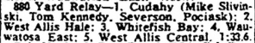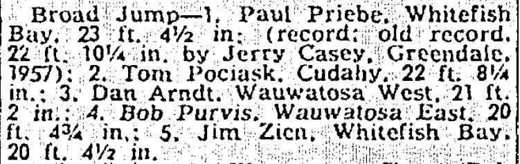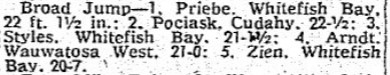 The 22-1-1/2 was the second best jump in Suburban Relays history. The great Ralph Welton of Shorewood went 23-0 in 1944. And the 63-10 from the relay team (Paul Priebe, Ed Styles, Jim Zien) was still the Bay school record in 1990 and I can’t imagine it having been close to broken since.