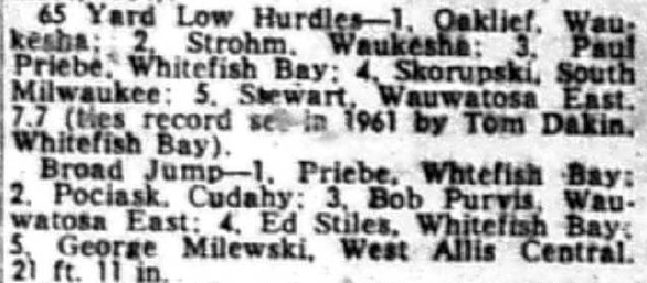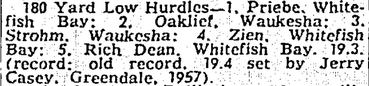 In that or any era, Suburban Outdoor records weren’t broken all that often. And Paul Priebe did it twice in one meet. And those two records had been held by the great Jerry Casey of Greendale.