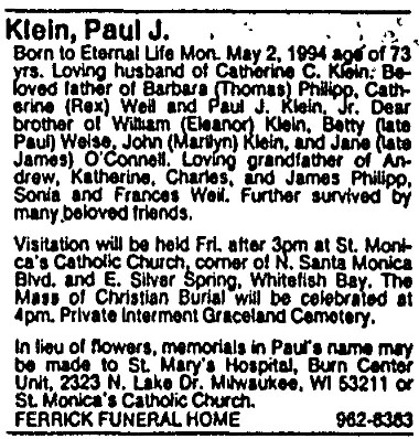 Paul Klein grew up with five siblings at 1135 E. Lexington, the son of a physician. My guess is that he went to Henry Clay, since when St. Monica school opened he would have been entering fourth grade. If he went to Henry Clay he would have been taught 8th grade science by young buck Charlie Roeder.