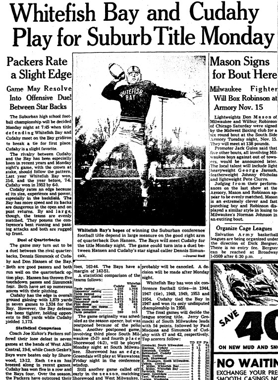 The 1954 Bay football team, led by Bob Nicolet, was one of the best in Bay and Suburban Conference history. They murdered everybody, except for Cudahy. That was just a 15-6 win. That team is rivaled in Bay history only by the stupendous 1962 team led by the great Tom Jankowski and a host of others.