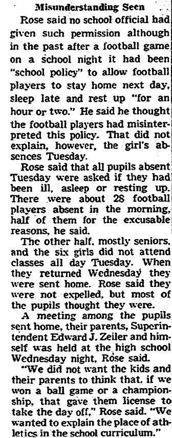 I was told that an all-school Assembly was scheduled on Tuesday morning to honor the Suburban Conference champion football team. It was severely marred by the fact that few members of the football team attended school that day. Many girlfriends followed suit.