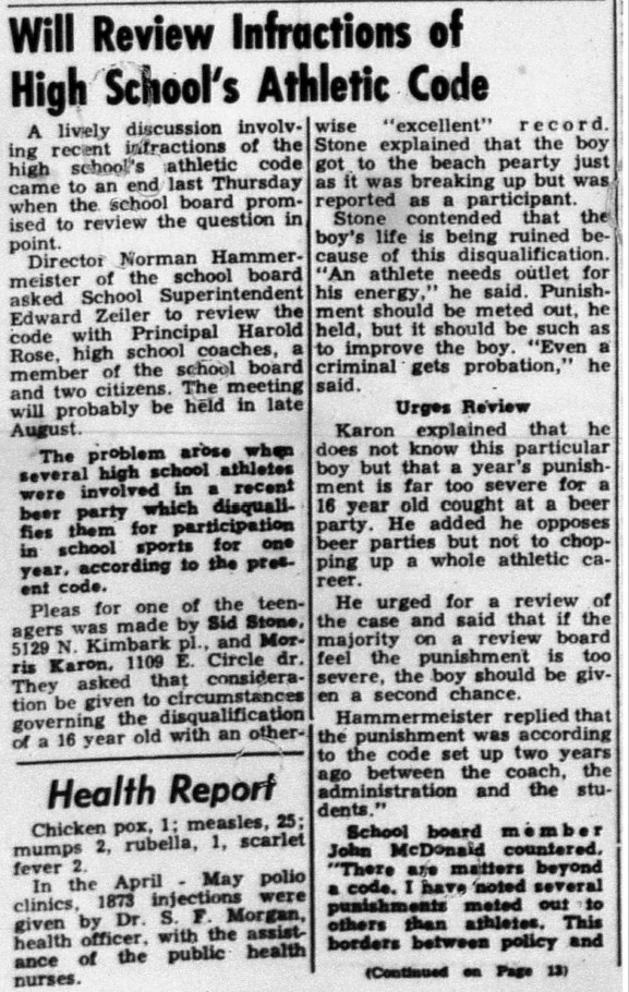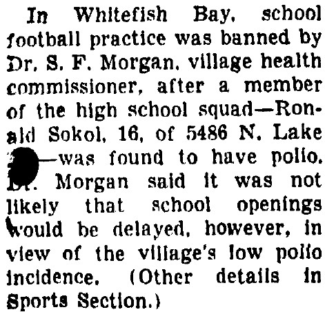 In late August, 1955, just after football practices started, a Bay player was diagnosed with polio.