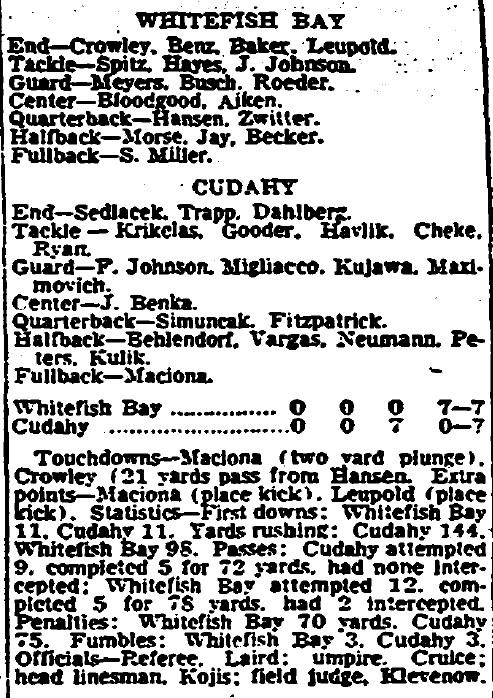 Cudahy hit paydirt in the 3rd quarter and converted the extra point. Early in the 4th quarter, Bay QB Don Hansen threw a 21 yard payoff pitch to Dave Crowley and Ed Leupold kicked the extra point to knot the score at 7-7. That was a pressure kick. There was no two-point conversion in those days. An extra point scored one point no matter how you got it.