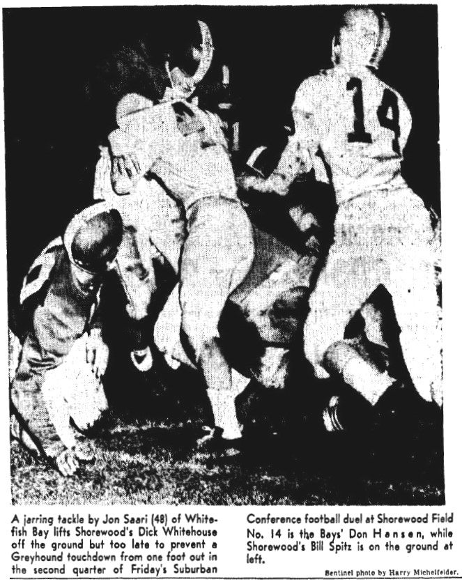 The Bay lost the Glory Cup game at Shorewood 13-12. Two second quarter fumbles, one at the Bay one and the other at the Bay 37 staked Shorewood to a 13-0 second quarter lead. Senior QB Don Hansen scored in the 2nd quarter to get the Bay back in it, trailing 13-6 at halftime. Sophomore fullback Tom Miller scored in the 4th quarter, but the extra point try was blocked. Both Bay TD’s were scored after long drives. The Bay should have won the game, but they didn’t.