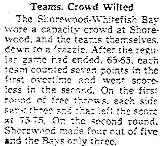 And they said the noise in the packed Shorewood gym was over-powering and the pressure was indescribable. One of them made one of two free throws late in regulation and then went one of two in the extra throws periods. He said that there is a reason why in his 80s he still shoots free throws in his driveway on nice summer nights.