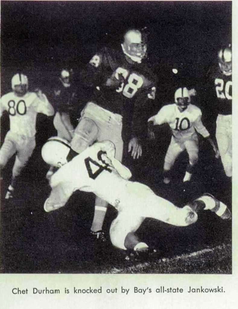 As good as the 1962 football team was, they did have one tough moment where they had to gut it out. South Milwaukee had beaten the Bay in 1961 and won the title at 8-0 over the Bays 7-1 and was sporting a 10 game Suburban Conference winning streak. In the second game of the season the Bay hosted South Milwaukee and the Red Rockets scored on a 36 yard run on the first drive of the game and converted the point. The Bay countered in the second quarter, but didn’t convert the point. The whole third quarter the Bay moved the ball, but shot itself in the foot and didn’t score while South Milwaukee had done nothing offensively since the first drive.