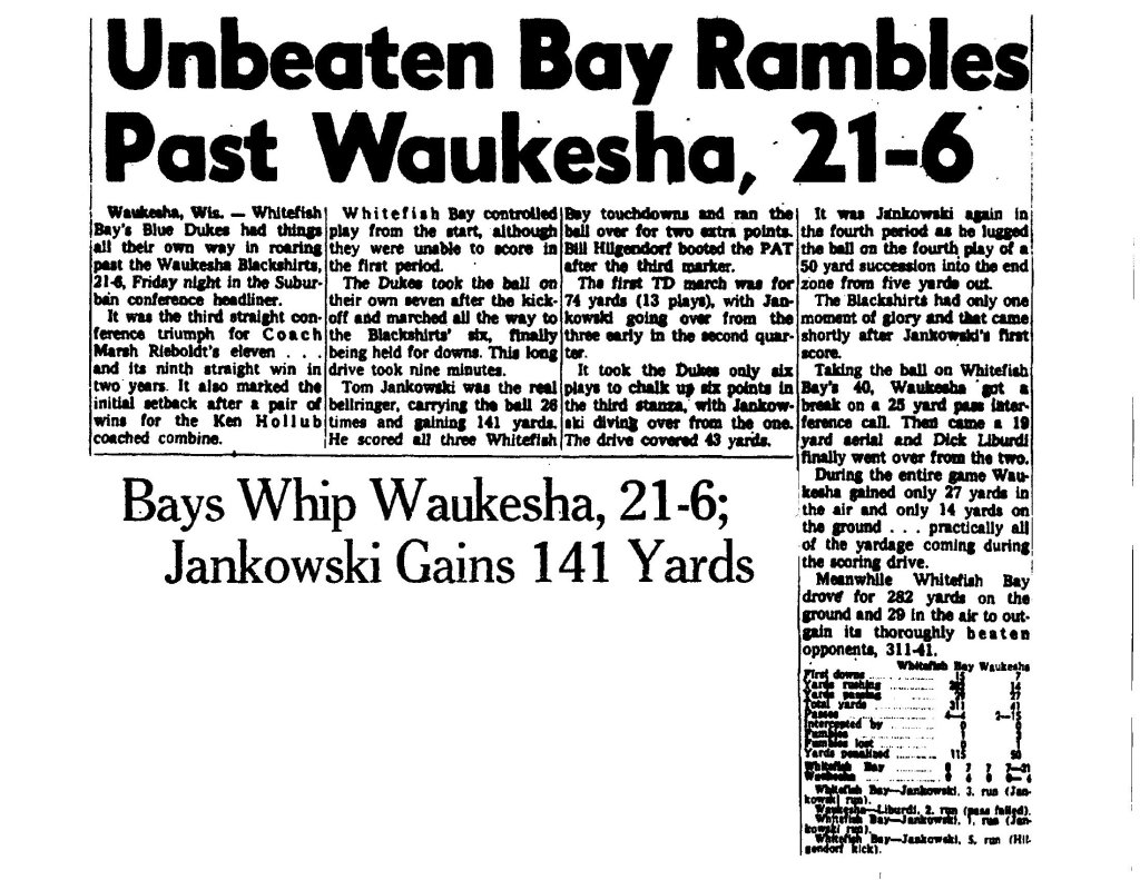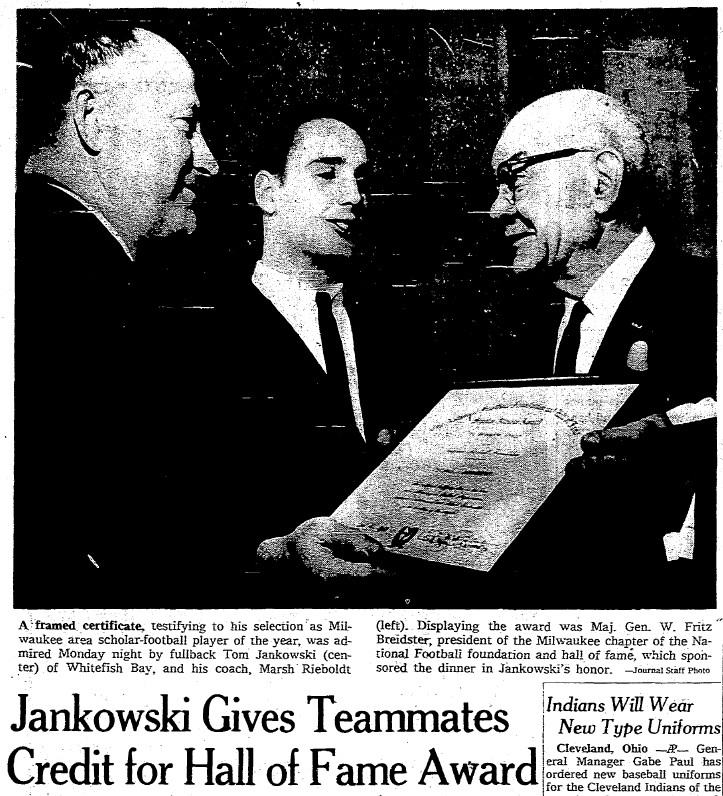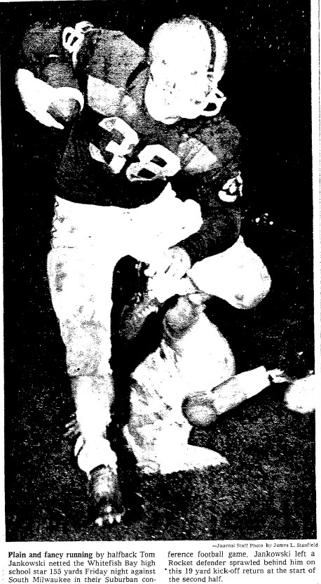 In 1992 Milwaukee Sentinel reporter Bud Lea wrote an article about the 1962 Bay football team, which he remembered from having covered them. Bud was with the Sentinel from the 1950s to the 1990s and was best known for covering the Lombardi Packers. But he also covered high school football for most of that time. He told one of the 1962 Bay players that Tom Jankowski was the best high school running back he’d ever seen.