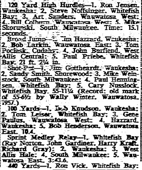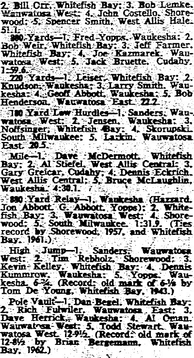 The Bay won the meet 63-61 over Waukesha, with Steve Noffsinger providing key points in the hurdles and Ron Vick anchoring the 880 Relay into second to preserve the team win.