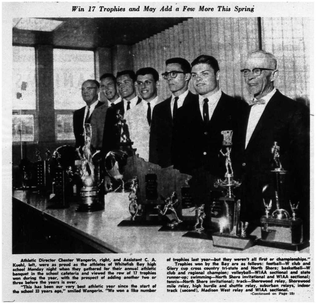 Track Relays: Won the Suburban in a rout, letting Waukesha know who was boss. Wins in the 440, Mile and Two-Mile Relays, along with individual wins by Dan Begel in the Pole Vault and John Seefeld in the Discus, while Bill Hilgendorf and Tom Jankowski also placed.