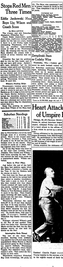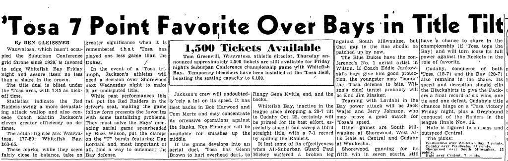 The 1949 season came down to the season-ending game at Wauwatosa. Bay wins, they win the undisputed title. Wauwatosa wins, they had a shot at the title depending upon results of other games. The smart money had the Red Raiders winning by seven.