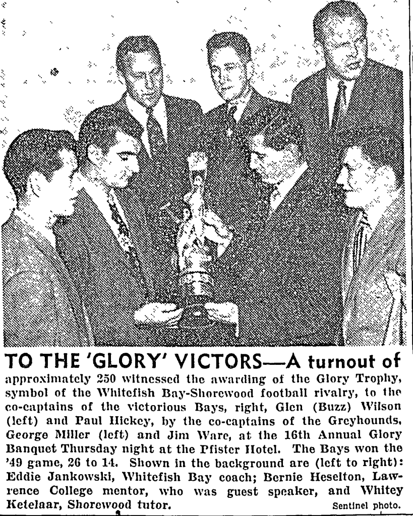The Glory Cup banquet held downtown at the elegant Pfister Hotel was a big deal in those days. Bay head coach Eddie Jankowski (member of the Badgers Hall of Fame and Packers Hall of Fame) was not the father of Tom Jankowski or even related at all.
